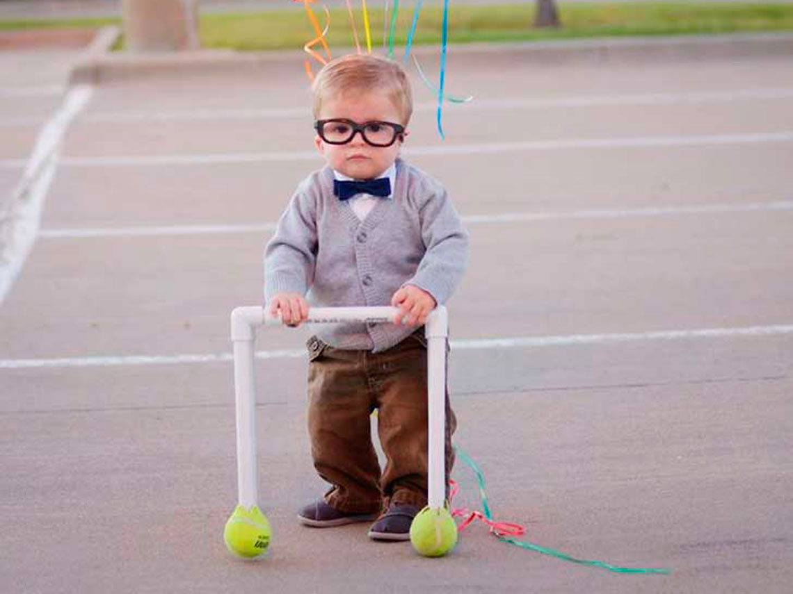 Una chaqueta beige o gris, una pajarita, unas gafas de pasta, un pantalón marrón y un andador. Eso es todo lo que necesitas para convertir a tu pequeño en Carl Fredricksen, el personaje de UP versión bebé. ¡Estará adorable!