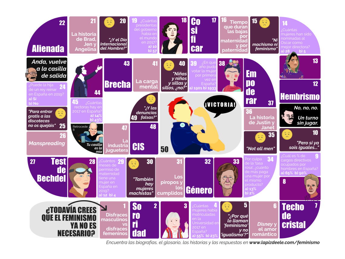 ¿Recuerdas el tradicional juego de la Oca? Todos teníamos un tablero en casa. Pues ahora, gracias a la iniciativa de la docente Ana Gómez Rudilla (más conocida en redes sociales como ‘lapizdeele’), se torna feminista. Sigue la misma mecánica, pero cada casilla gira en torno a una mujer que ha destacado en algún campo. Este tablero está disponible para descargar de manera gratuita en la página web de la profesora.