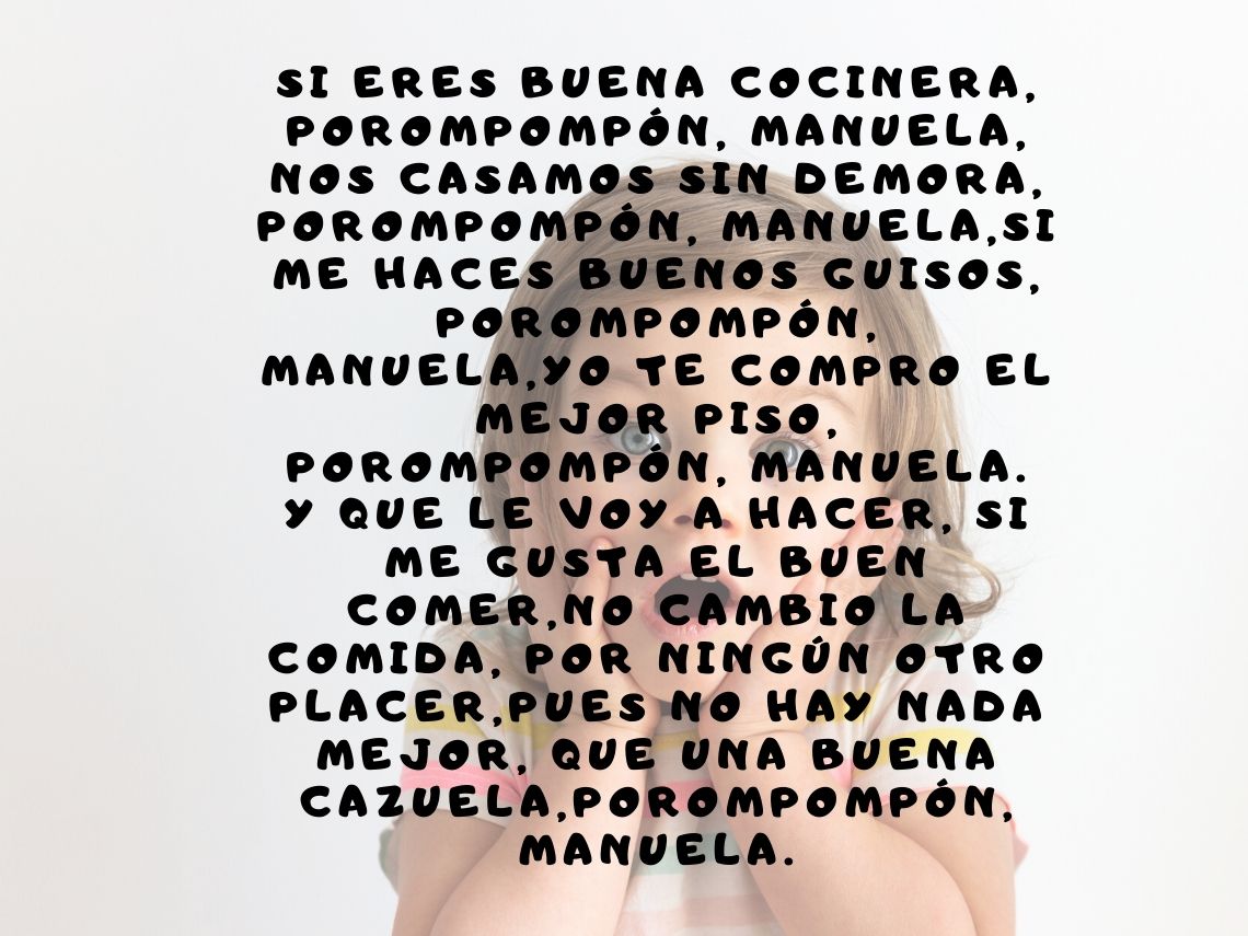 Esta canción de los Payasos de la Tele (Miliki, Gaby y Fofito) ha sido coreada y cantada por muchos niños durante años. Sin embargo, si analizamos la letra, parece que las únicas virtudes que tiene la pobre Manuela es cocinar al gusto de su querido y, por otro lado, parece que es lo único digno de valorar en una mujer, según la letra… Además de ese concepto anticuado de “te compro un piso” …