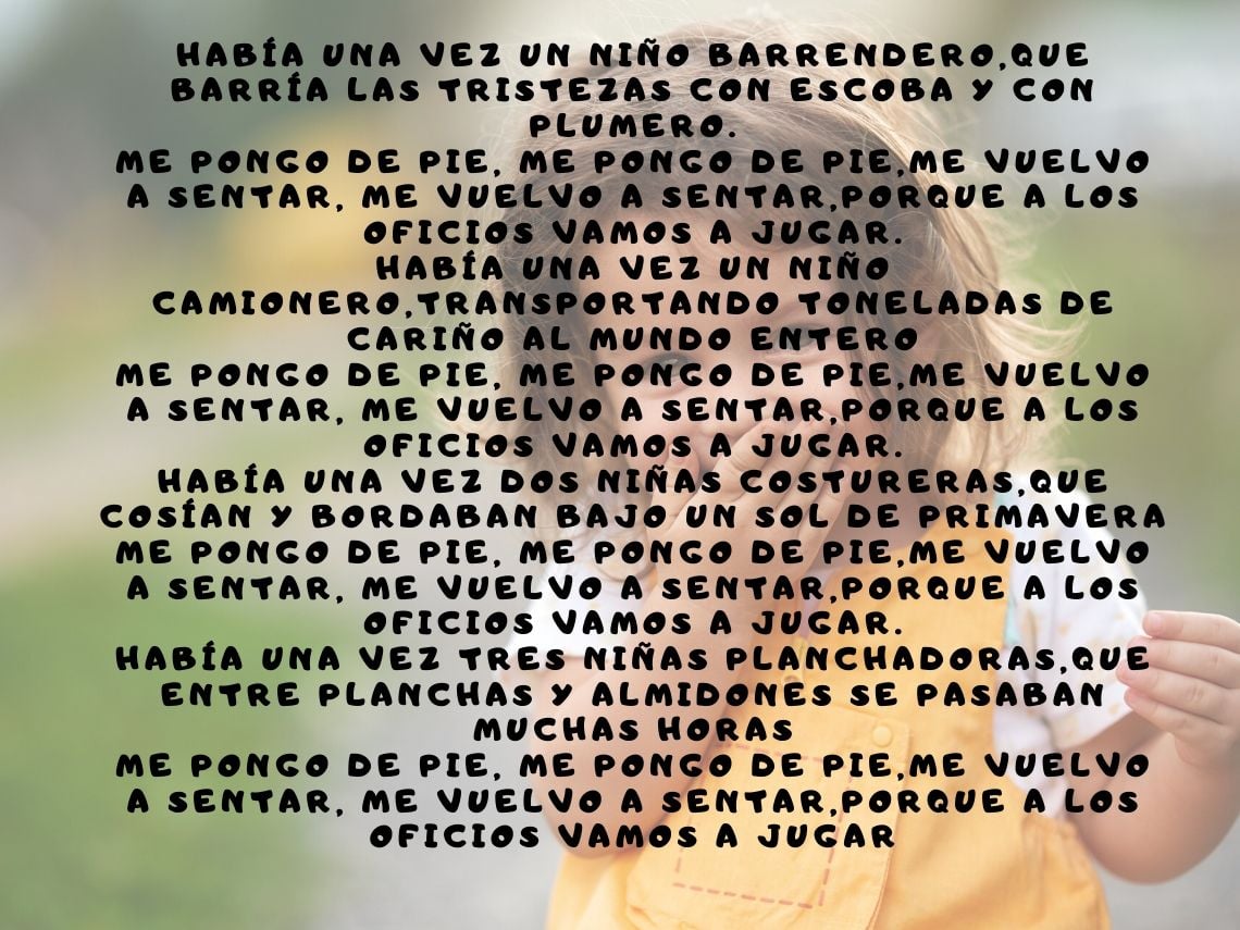 Esta canción infantil popularizada por Teresa Rabal era de gran ayuda para conocer diferentes oficios, como camionero, barrendero, carpintero, costurera, planchadora… lo que escama de la letra es que cuando habla de las niñas, los oficios a los que se alude son planchadoras y costureras, podría haberse hablado de niños planchadores o costureros y niñas camioneras o carpinteras, ¿por qué no?