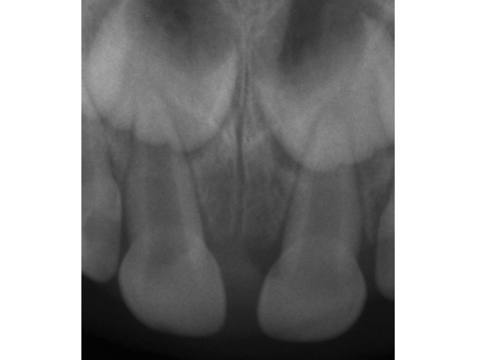 En la radiografía se comprueba que está entero, que no se ha fracturado la raíz. Los "globos" que se ven encima de ellos es el germen de los dientes permanentes que están en formación. Por suerte, en este caso no hay que hacer nada con la pieza dañada. El diente está bien y prácticamente ha vuelto a recobrar su color original.