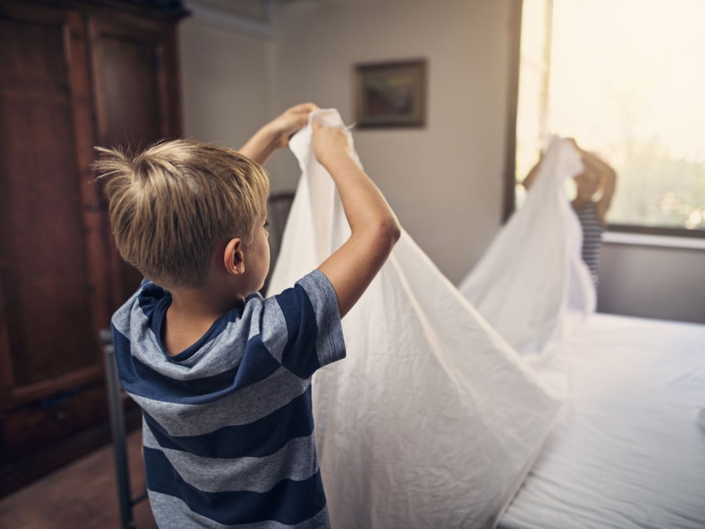 No podemos pretender que con esta edad haga su cama pero sí puede perfectamente estirar la sábana o el edredón y colocar su almohada, más o menos bien.