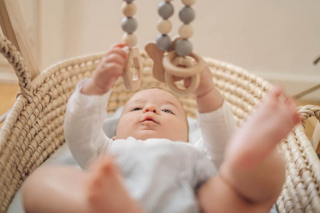 De 0 a 3 meses. Siempre buscando que los objetos o los juguetes fomenten el libre movimiento del bebé para facilitar el desarrollo natural de sus habilidades motrices.