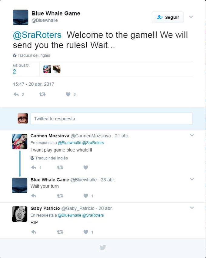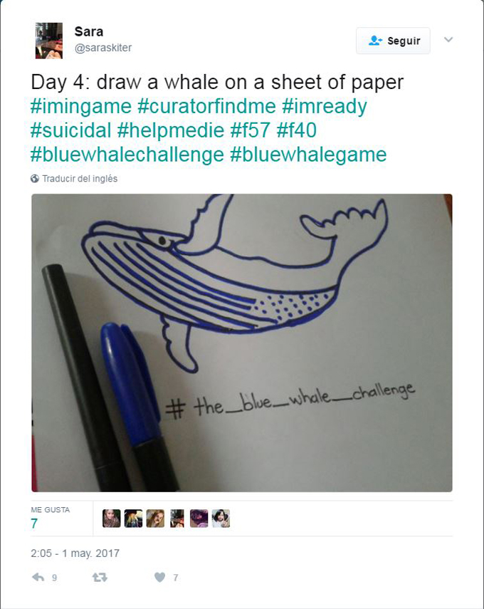 Uno de los retos consiste en publicar en la cuenta de Twitter del jugador el hashtag “I_am_whale” y cuando el curador acepta que está bien, se pasa al siguiente reto. Twitteando esta etiqueta, se pueden descubrir casos e intentar intervenir con ayuda. Muchas veces, hemos podido comprobar que, incluso, los mismos adolescentes se ayudan mutuamente a no caer en el juego.