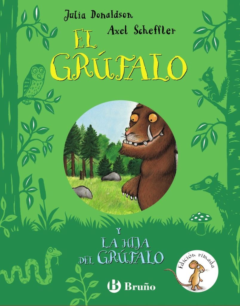 Además de los álbumes, con texto no rimado (no es nada fácil acertar a reproducir la sonoridad de Donaldson en otros idiomas), los libros de actividades y los libros para bebés, Bruño ha publicado una apetecible caja-regalo que incluye El Grúfalo y La Hija del Grúfalo en edición rimada, formato cuadrado y cartón. Seguro que está presente en muchos cumpleaños y cartas a los Reyes Magos.