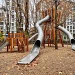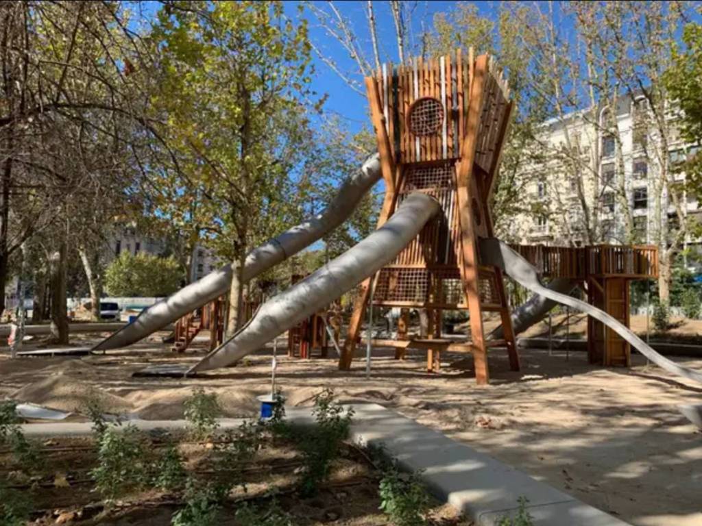 La zona recreativa es realmente bonita. Fabricada con torres y plataformas de madera, de esta estructura salen seis toboganes con forma y recorrido distintos que harán las delicias no solo de todos los niños y niñas que habitan en esta zona de Madrid, sino también de todos los que hagan una parada en medio de una visita familiar al centro de la ciudad. Los toboganes tienen alturas que varían de uno a seis metros, por lo que son aptos para peques de distintas edades, como es costumbre en los parques infantiles estilo multiaventura que tanto se ven ahora en las ciudades.