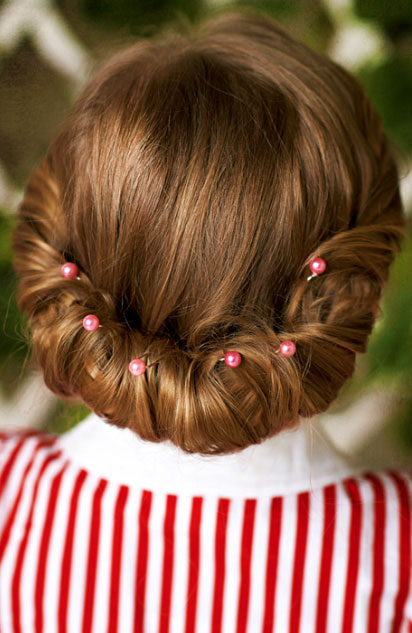 Con dos mechones que usaremos como guía, vamos enrollando el cabello poco a poco y sujetamos con horquillas hasta que lo notemos seguro. Por ultimo añadimos horquillas para darle un toque divertido y colorista