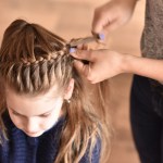 Realizamos dos particiones dejando raya al lado, con cada partición realizamos una trenza de cuatro cabos de raíz que finaliza en una sola trenza.A medida que vamos adelantando el peinado vamos poco a poco sacando cada pétalo para que vaya tomando forma de lacito.