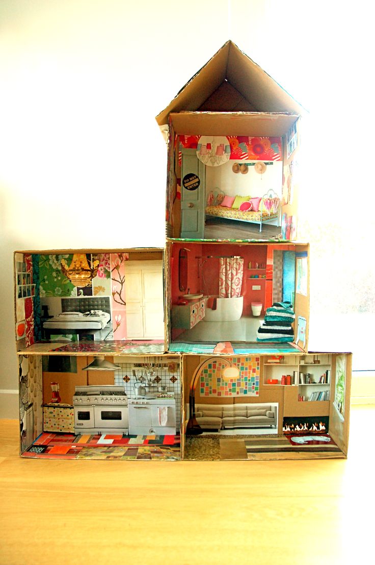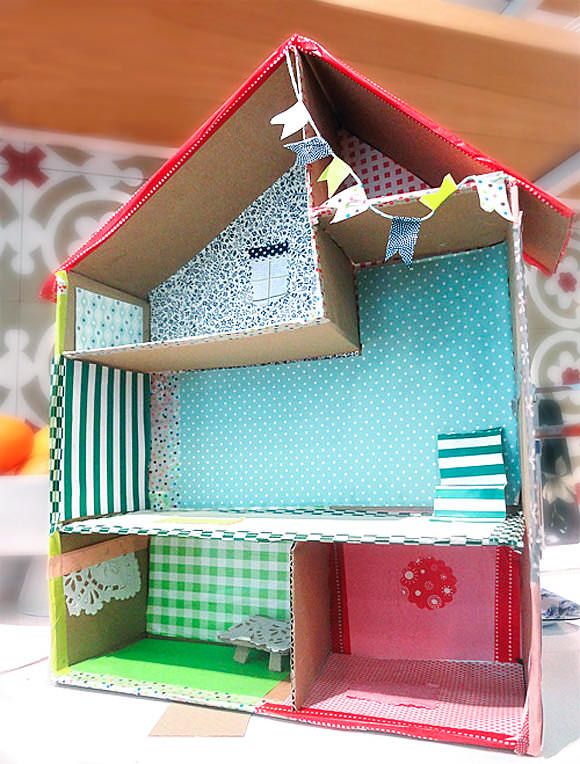 Para los más minuciosos, ¿qué tal hacer una bonita casa de muñecas? Si te fijas, los muebles no son más que fotos recortadas de revistas. Material barato, reciclado, y con el que padres e hijos disfrutaréis un montón. Encontrado en www.rubancassette.com