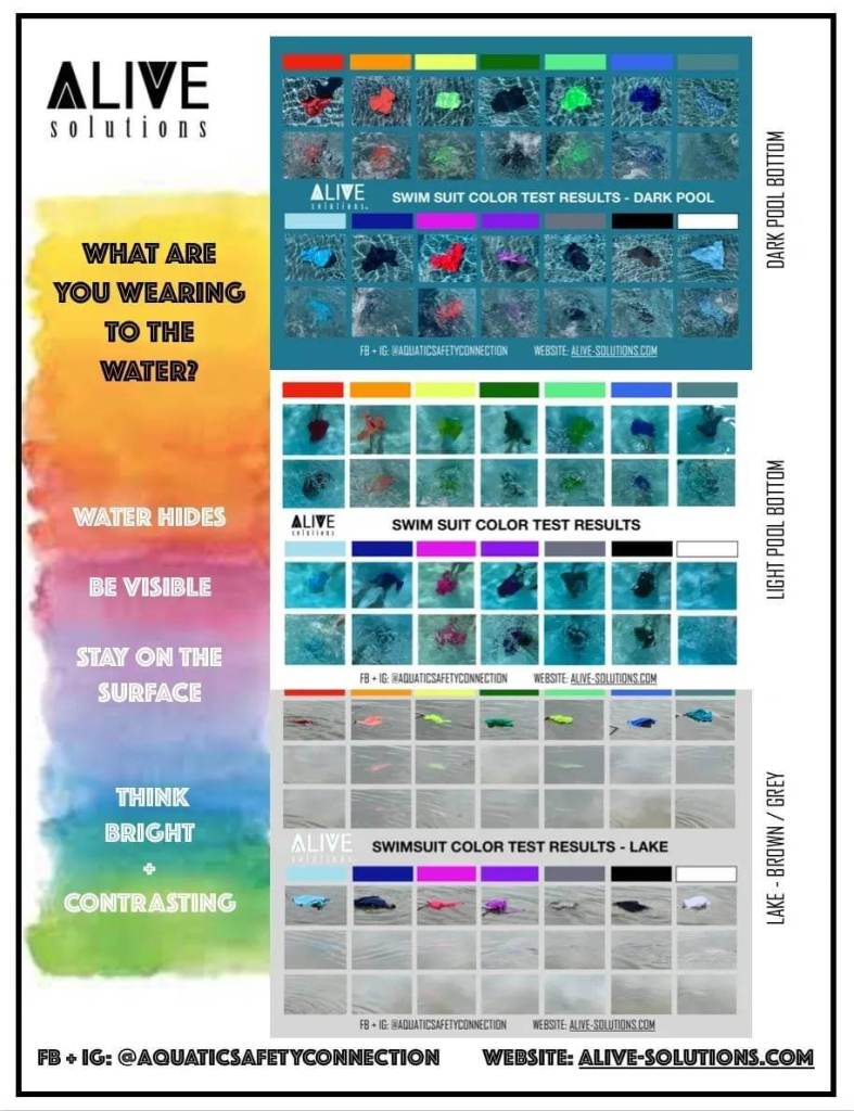 La referencia de este consejo práctico de seguridad acuática viene de un estudio de Alive Solutions, una empresa especializada en seguridad acuática, que realizó una prueba real con 14 colores diferentes de bañadores, tanto en piscina como en lago. Las tomas se hicieron desde distintos ángulos: superficie, orilla y vista elevada (como desde un muelle), simulando una búsqueda real. ¿El objetivo? Ver qué tonos se detectan mejor en distintos entornos.