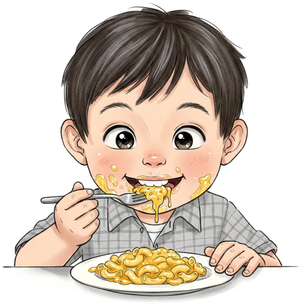 Pino observó que, en la mesa de al lado, había otro niño de su edad. Él estaba comiendo los macarrones, de forma pausada. Su comida no desaparecía, al contrario: parecía que los macarrones se duplicaban.