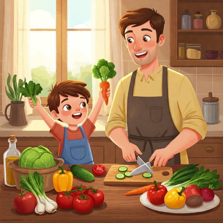 Con la ayuda de su papá, que es un gran cocinero, Jota aprendió a escoger los alimentos más divertidos para él, aquellos que lo llenaban de energía. También le enseñó a no dejarse engañar por los alimentos que son perezosos para Jota porque si los evita podrá sentirse bien y tener fuerzas para todo.