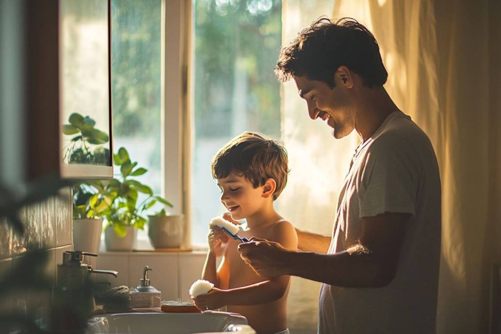 Un padre se afeita con su hijo. Encuesta demuestra que a los padres les sigue costando abordar la pubertad (Midjouney- RG)