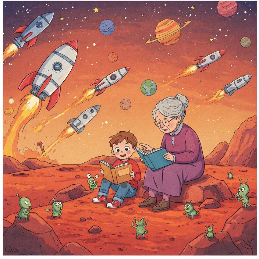 Para Marcelo, su abuela era mucho más que una marciana, era una viajera y descubridora de palabras y nuevas historias. Ella le contaba anécdotas de cuando ella había viajado al espacio y visitado el planeta Marte.
