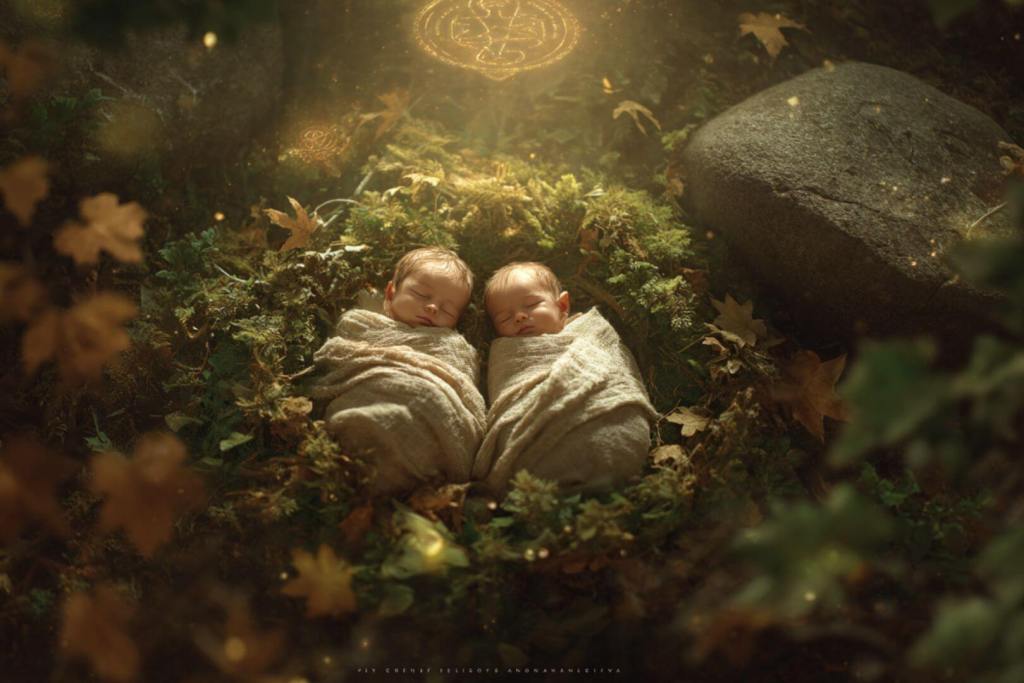 Dos recién nacidos duermen en un lecho natural bajo luz dorada y símbolos místicos celtas. Midjourney-RG.