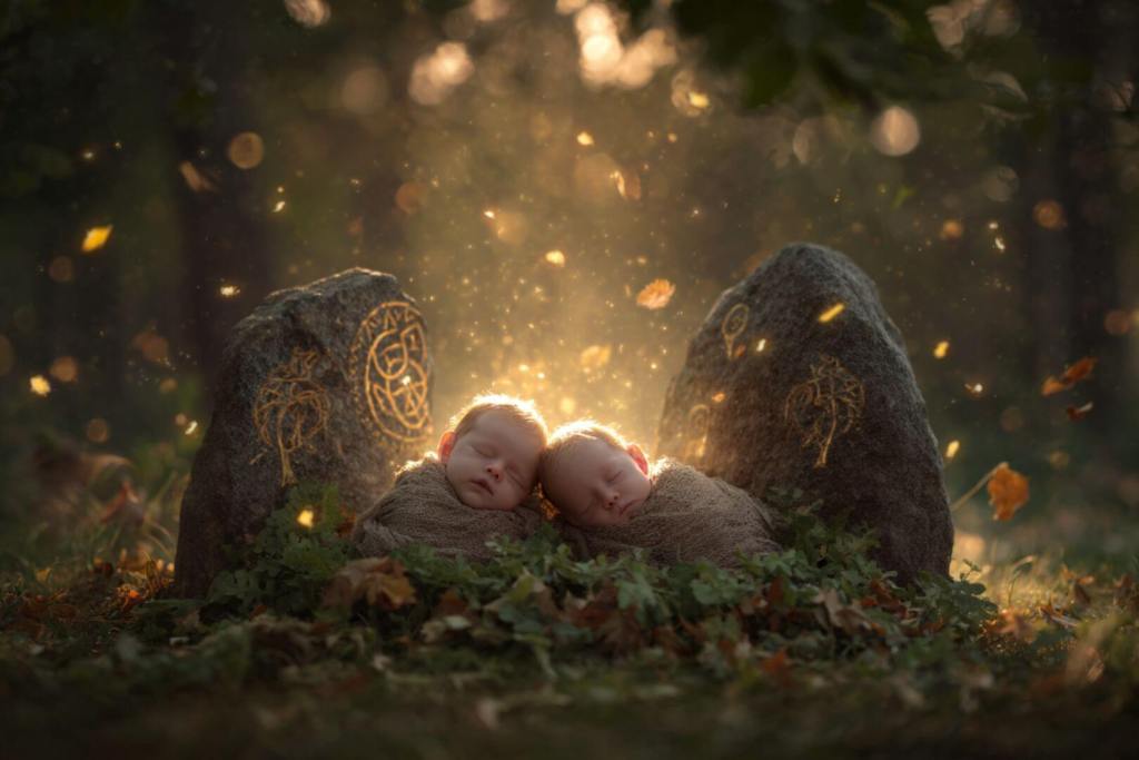Bebés dormidos junto a piedras con runas celtas, en bosque otoñal iluminado.
