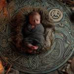 Bebé dormido sobre símbolo celta tallado, rodeado de velas y decoración tradicional celta.