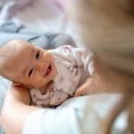Mother carrying her smiling baby girl at home