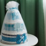 - Puedes añadir en el medio de la tarta, justo en el espacio que deja el tubo de cartón, algún que otro detalle para el bebé (un peluche, una cremita de bebé, unos geles o cualquier otro utensilio o detalle para el peque). De esta forma, tu regalo será mucho más original y personalizado.