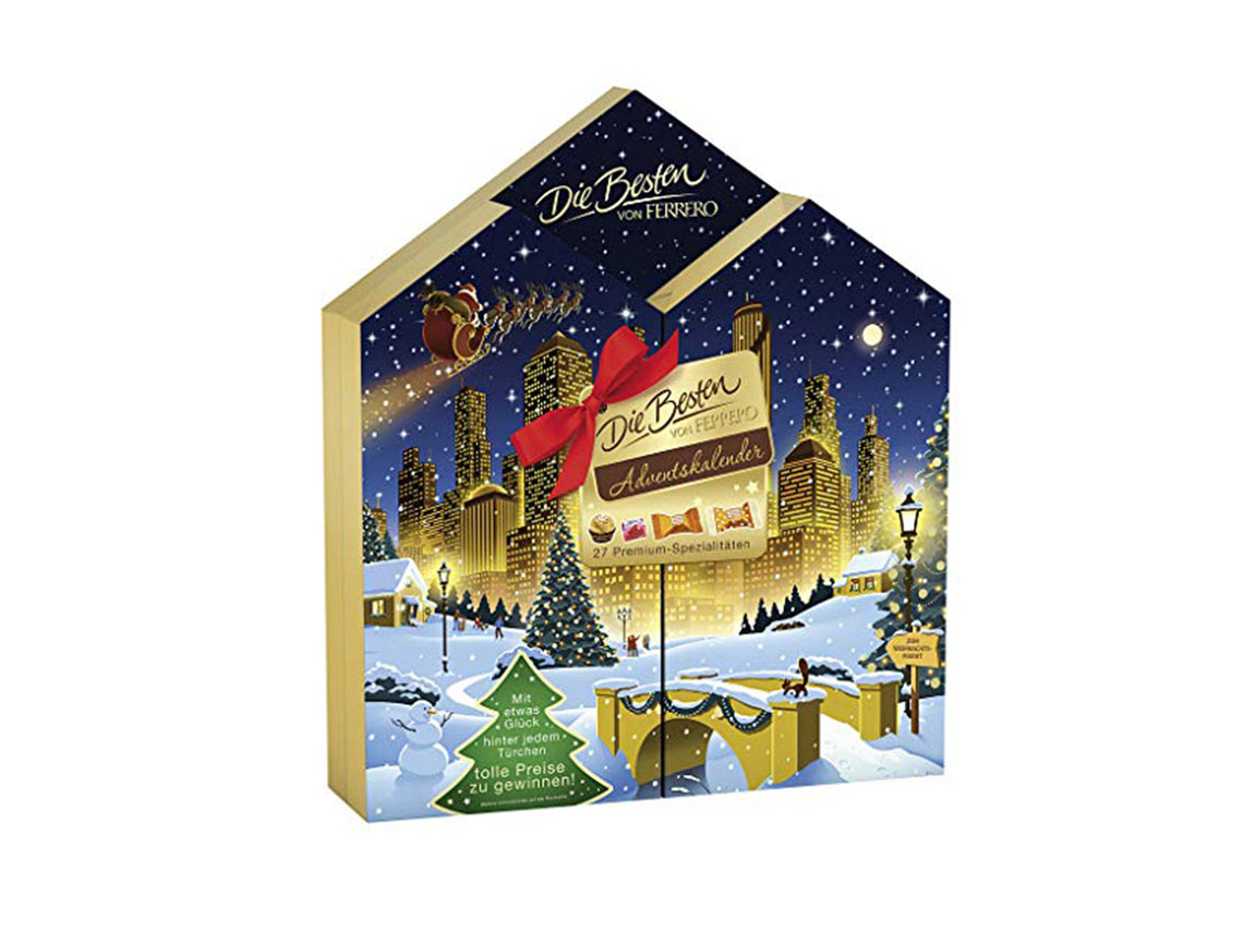 Un calendario especial de los chocolates y bombones Ferrero, con un diseño de lujo en la caja desplegable en 3D, y cuatro de sus especialidades más populares, incluyendo Ferrero Rocher y Mon Cherie.