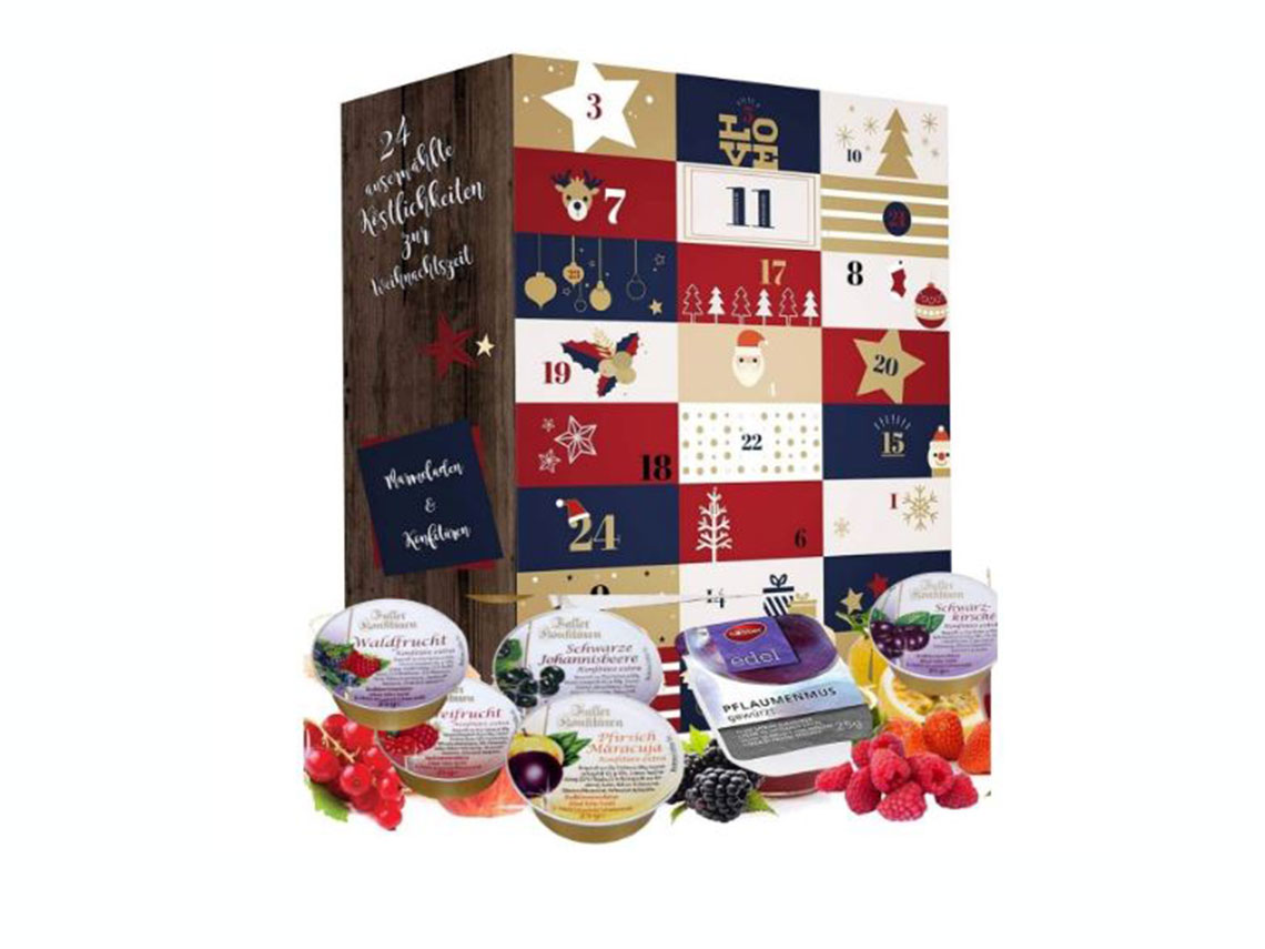¡Confituras y mermeladas para los desayunos pre-navideños! Si te encanta la mermelada y estás deseando probar nuevas variantes este es tu calendario de adviento. Con un surtido de 24 confituras y mermeladas diferentes para alegrar tus tostadas mañaneras.