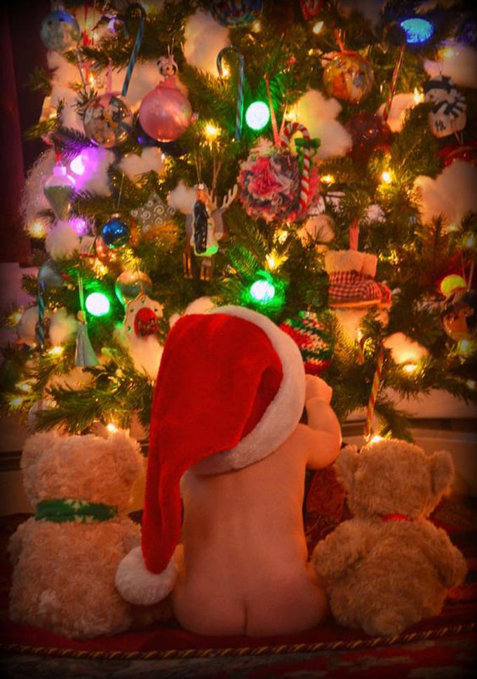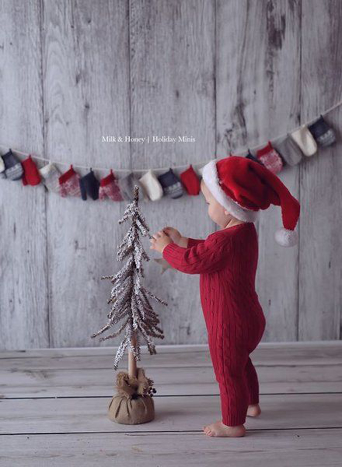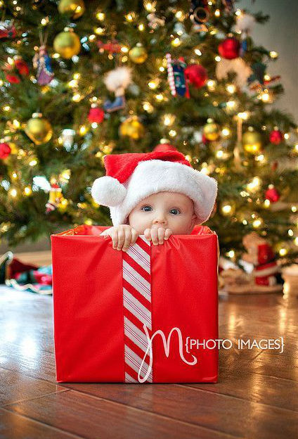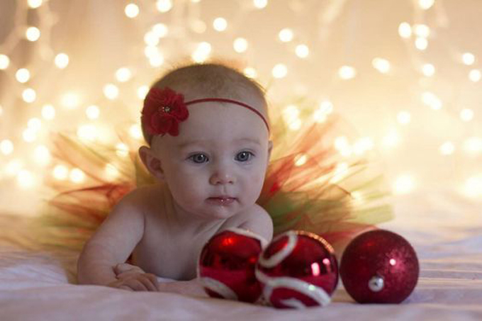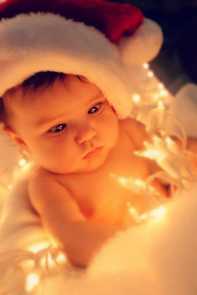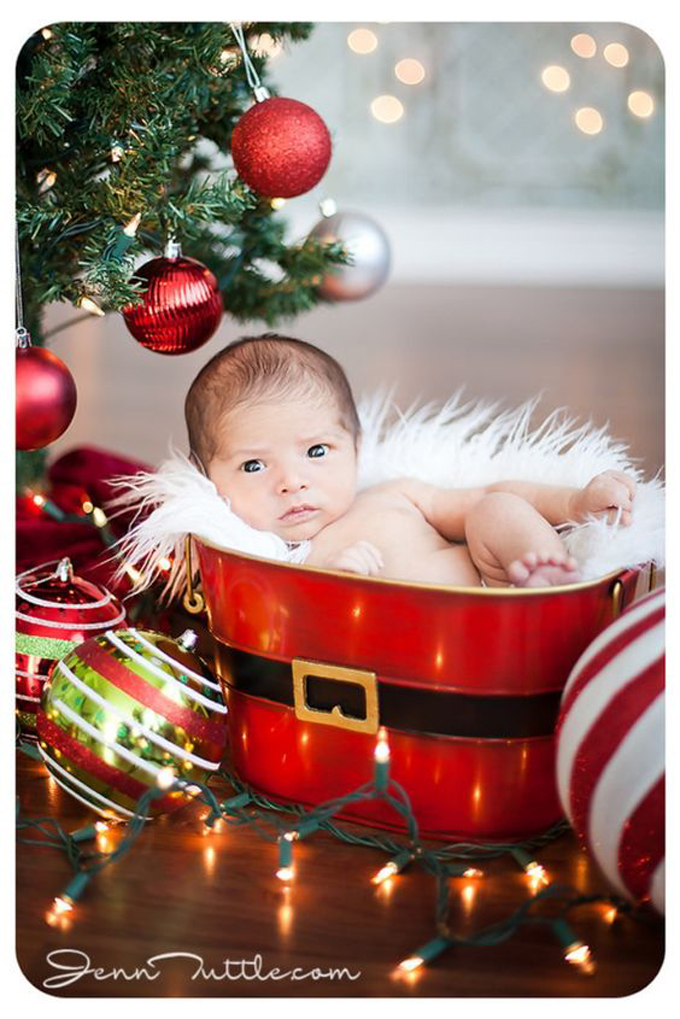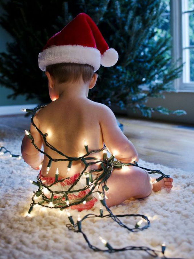Por supuesto, tienes que fotografiarles desde su altura y por ello es muy importante la iluminación. Si sientes que no tienes suficiente para poder hacer la foto deseada, deja que tu pequeño juegue con las luces del árbol de Navidad (siempre con muchísimo cuidado). Ayudará a que se diviertan mientras haces la foto, servirá de iluminación y además el toque navideño está garantizado. Si le vistes de Papá Noel, estará mucho mejor.