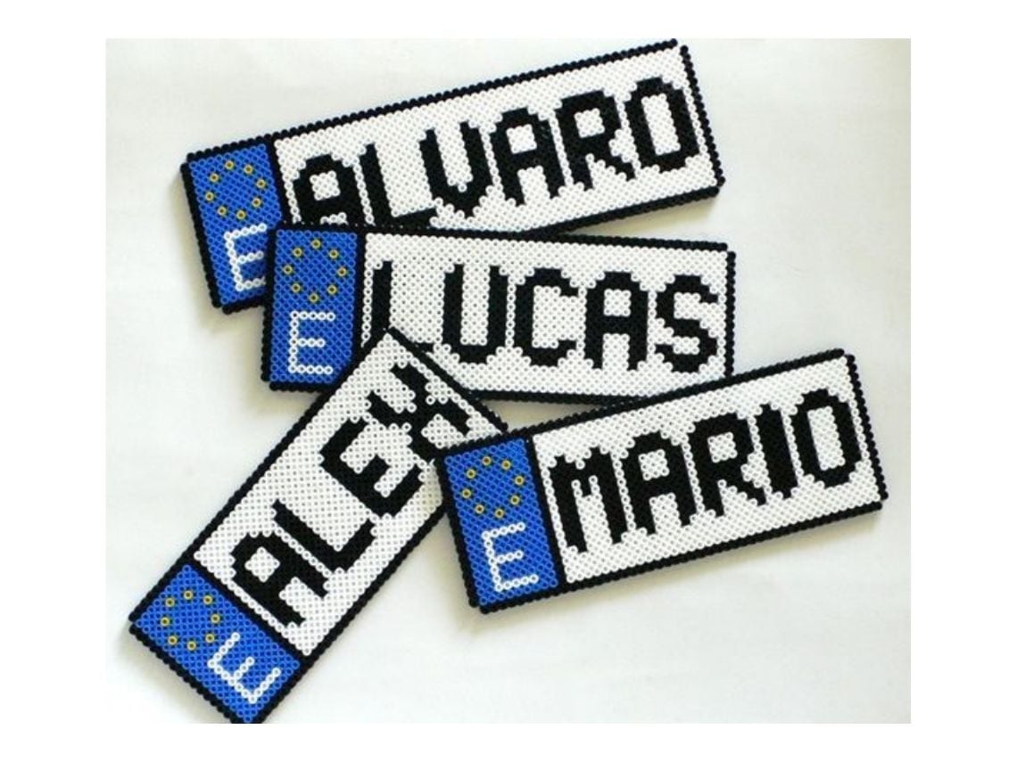 Seguro que en alguna ocasión te pedirán hacer un Hama Beads con un nombre. En esta imagen te mostramos una idea original que puedes plasmar como si fuera una matricula de coche que en lugar de tener números lleva los nombres que hayas elegido.