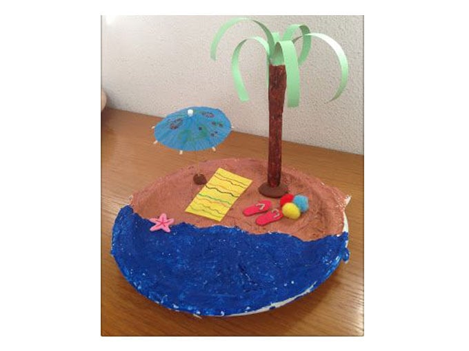 Pensado para todos aquellos que, de momento, tienen que esperar para ver el mar. Se puede hacer una preciosa isla con un plato reciclado. Todo lo que necesitaréis será témperas y una palmera de papel.