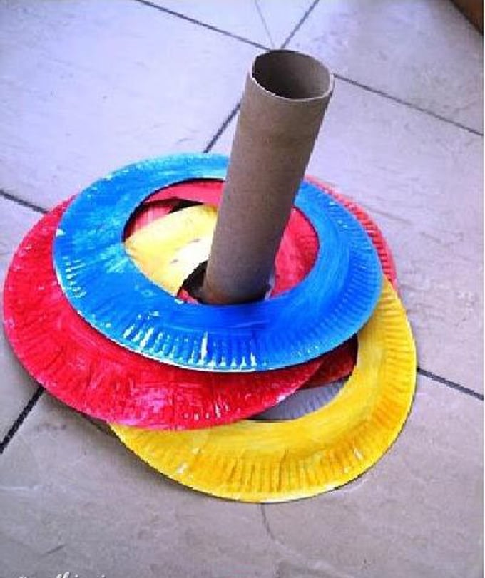 Verano y niños en casa. Nada como crear un juego para jugar al aire libre y, además, si se hace con materiales reciclados puede quedar mucho mejor. Solamente hay que rescatar un tubo de papel de cocina vacío y tantos platos como discos queramos tener. Después de cortar el centro de los platos, los pintaremos con temperas y… ¡a jugar!