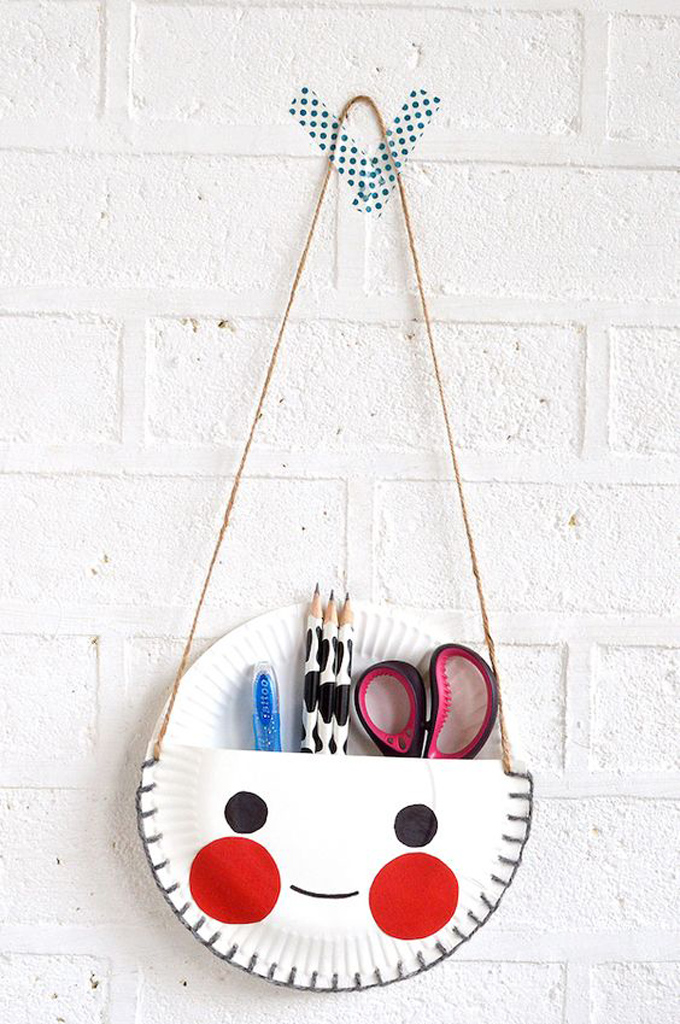 Para hacer este precioso lapicero bastará con elegir dos platos de cartón, unirlos con pegamento y cortar la mitad de uno de ellos. Después crearemos una cara y colgaremos una cuerda. ¡Súper fácil y súper guay!