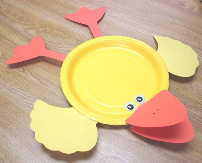 Un precioso patito hecho con un plato de cartón de color amarillo. Acabaremos pegándole unas patas y un pico hechos con papel de colores y listo.