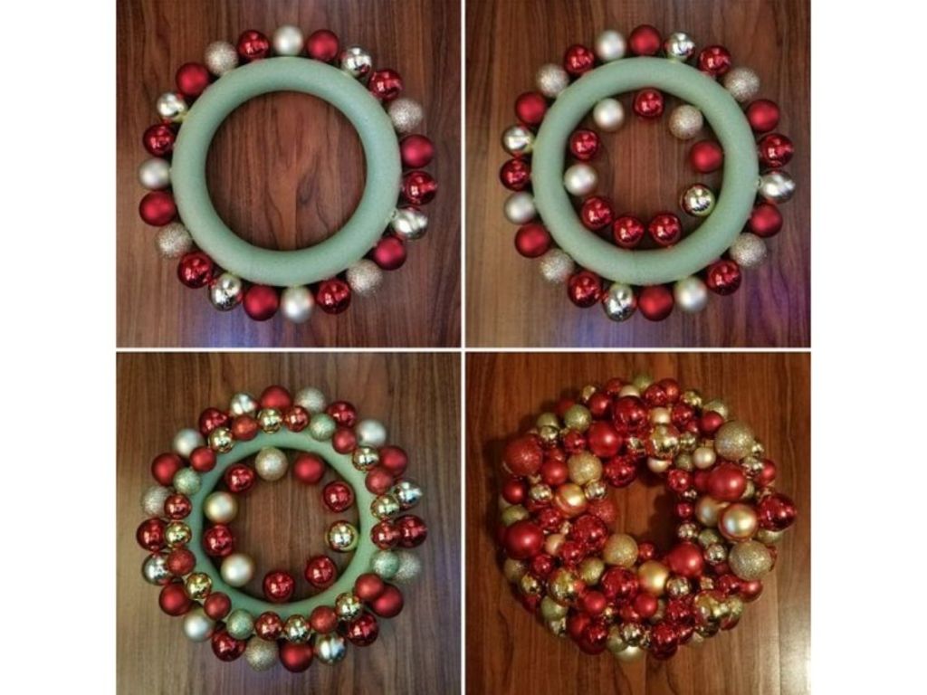 Ejemplo de ello es esta maravillosa corona de Navidad que podemos poner en la puerta de entra a casa. Para hacerla bastará con que cerremos en círculo el churro y peguemos con un poco de silicona muchas bolas y adornos hasta taparlo por completo.