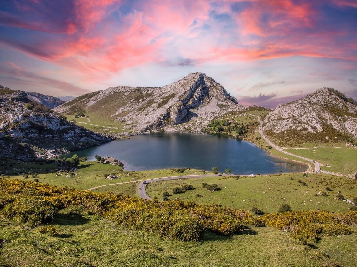Los Lagos de Covadonga son una auténtica joya de la naturaleza situados en los Picos de Europa en Asturias. Los lagos se encuentran situados bastante cerca y están rodeados de los montes más altos de los Picos de Europa. Es un lugar perfecto para visitar con niños y ver una escena impresionante, con vacas recorriendo las grandes extensiones de pastos.