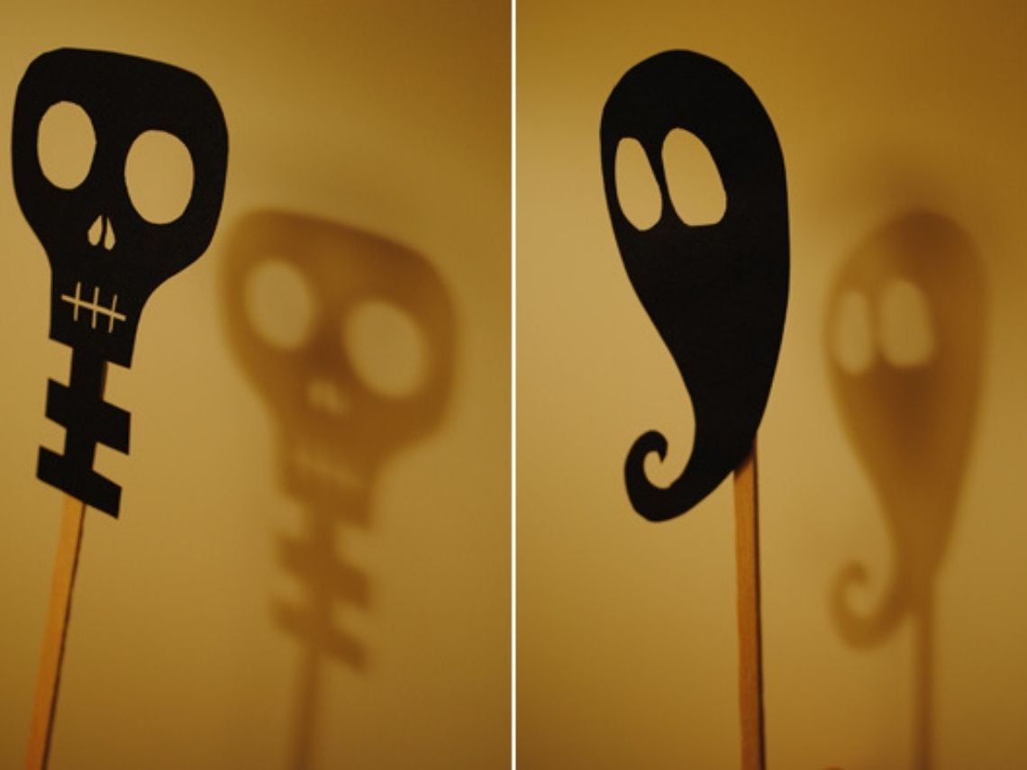 Hacer estas sombras tan terroríficas es bien sencillo. Imprimís recortables de Halloween (fantasmas, esqueletos, calaveras, calabazas,…) y los pegáis en un palillo de los largos. O, si no queréis imprimir, podéis dibujarlas sobre cartulina y recortar.