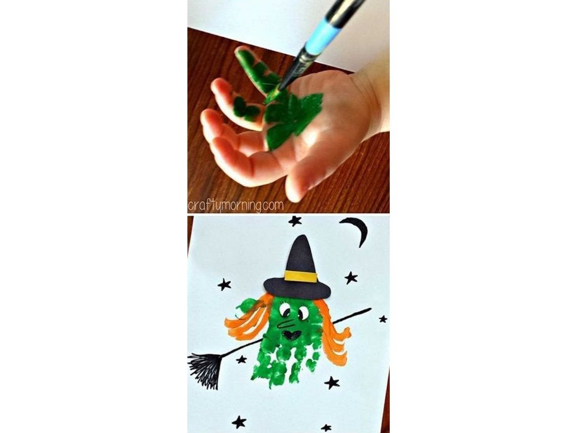 Pintáis la palma del peque de color verde y la plasmáis en un folio. Esa será la bruja. Solo faltará pintar o colocar encima la escoba, el sombrero y los ojos.