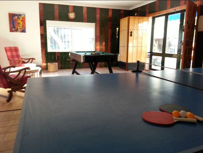 Si tienes pensado hacer una escapada a Huelva alojarse aquí puede ser una buena idea, pues es un lugar en el que hay una granja, tiene biblioteca para que podáis leer y relajaros, cuenta con un castillo hinchable donde los pequeños lo pasarán en grande, un billar, un ping-pong e incluso mesa de hockey así como varios juegos de mesa en una sala llena de sofás para que podáis sentiros a gusto mientras jugáis o esperáis vuestro turno. Además hay una pequeña casita exterior completamente amueblada donde tus hijos se sentirán como en casa.