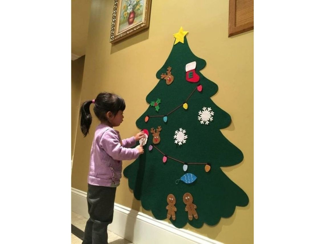 Una de las dos opciones que presentamos para los más peques de la casa. Tradicionalmente, las bolitas se cuelgan del árbol de Navidad, pero, ¿qué tal si este año se pudieran pegar con un trozo de velcro? Para hacer este árbol bastará con recortar la forma en un trozo grande de fieltro verde y, con fieltro de otros colores, crear cuantos adornos nos gusten: guirnaldas, hombres de nieve, copitos, bolitas y lo más importante: ¡la estrella! Después, pegad un trocito de velcro en la parte de atrás de cada adorno y dejad que los niños decoren con su imaginación. ¡Pueden cambiar sus adornos todos los días si quieren!