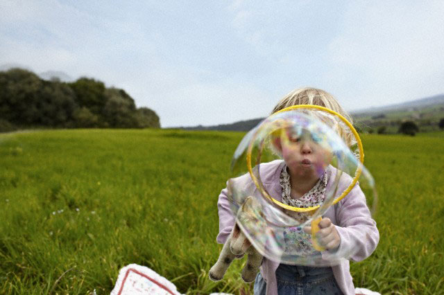 Prepara una solución con 700ml de agua, 120ml de lavavajillas, 60g de maicena, 1 cucharada de levadura en polvo y 1 cucharada de melaza clara. Mide 2cm de cordel y pásalo a través de 2 pajitas de plástico. Ata los extremos del cordel y separa las pajitas para hacer las asas de la varita de hacer pompas. Sumérgela en el líquido, levántala en el aire y, lentamente, camina hacia atrás. Igual a la primera no funciona, pero ten paciencia... ¡pronto conseguirás pompas gigantes!