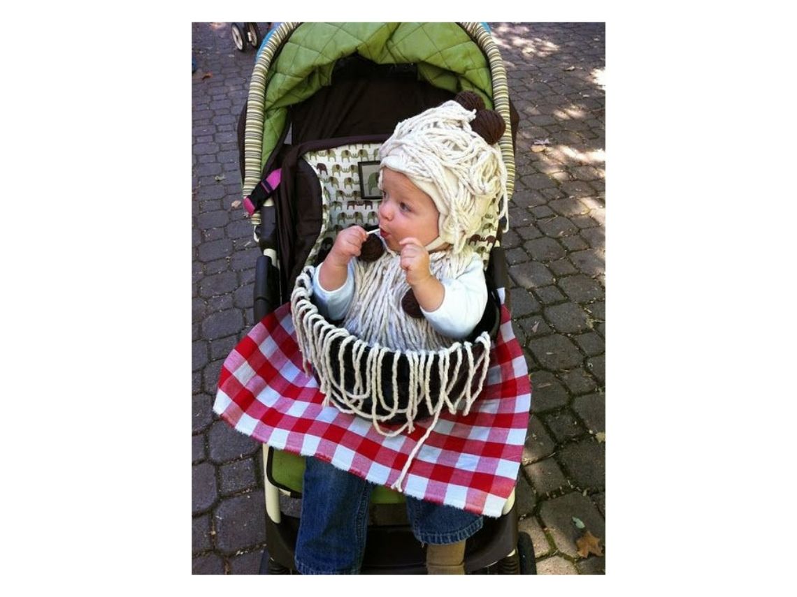 Este disfraz casero para bebés nos demuestra que el carrito puede ser el complemento perfecto y el pequeño un plato de pasta irresistible.