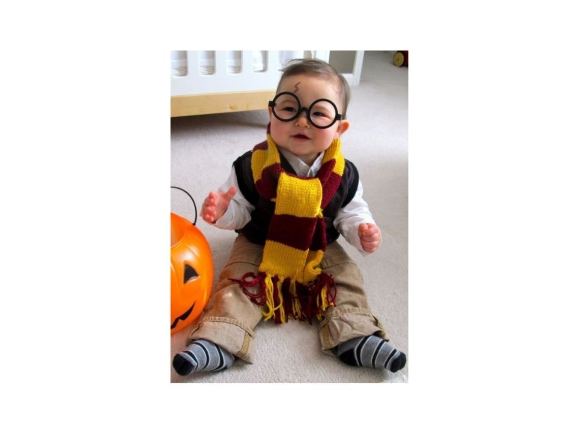 Con unas gafas redondas sin cristales, una bufanda pequeñita granate y amarilla y un pantalón beige, ¡tendréis el traje perfecto de Harry Potter!