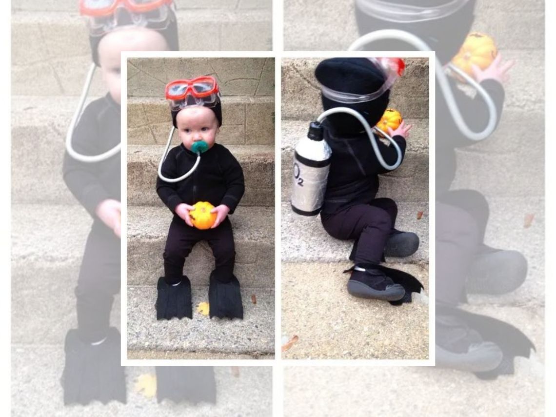 Este disfraz es viralPara hacerlo tan solo guardad una botella de agua vacía, forrarla con papel de aluminio y escribid ‘CO2’ con un rotulador. Después, haréis unas calzas al bebé a modo de aletas, colocaréis un tubo que vaya hasta el chupete y le vestiréis de negro. ¡Lo más!