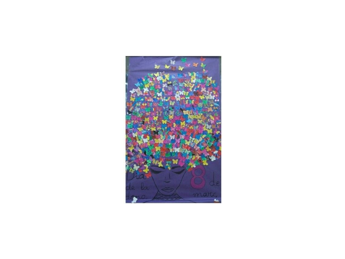 Esta manualidad es muy metafórica: simula el pensamiento de la mujer, que debe ser libre como las mariposas. Para hacerla tendréis que armaros de paciencia, pues abrís de recortar un montón de mariposas de colores y pegarlas sobre una cartulina lila con una cara femenina dibujada.