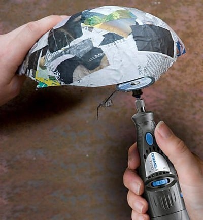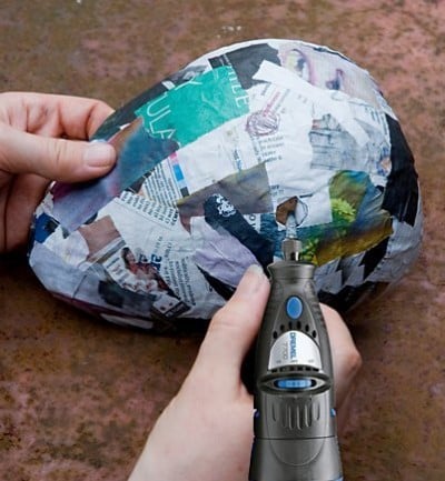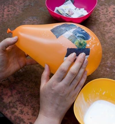 Infla el globo y coloca sobre él trozos de papel mojados en cola vinílica -especial para papel y cartón-. Pega varias capas de papel sobre la superfice del globo y deja que se sequen y se endurezcan.