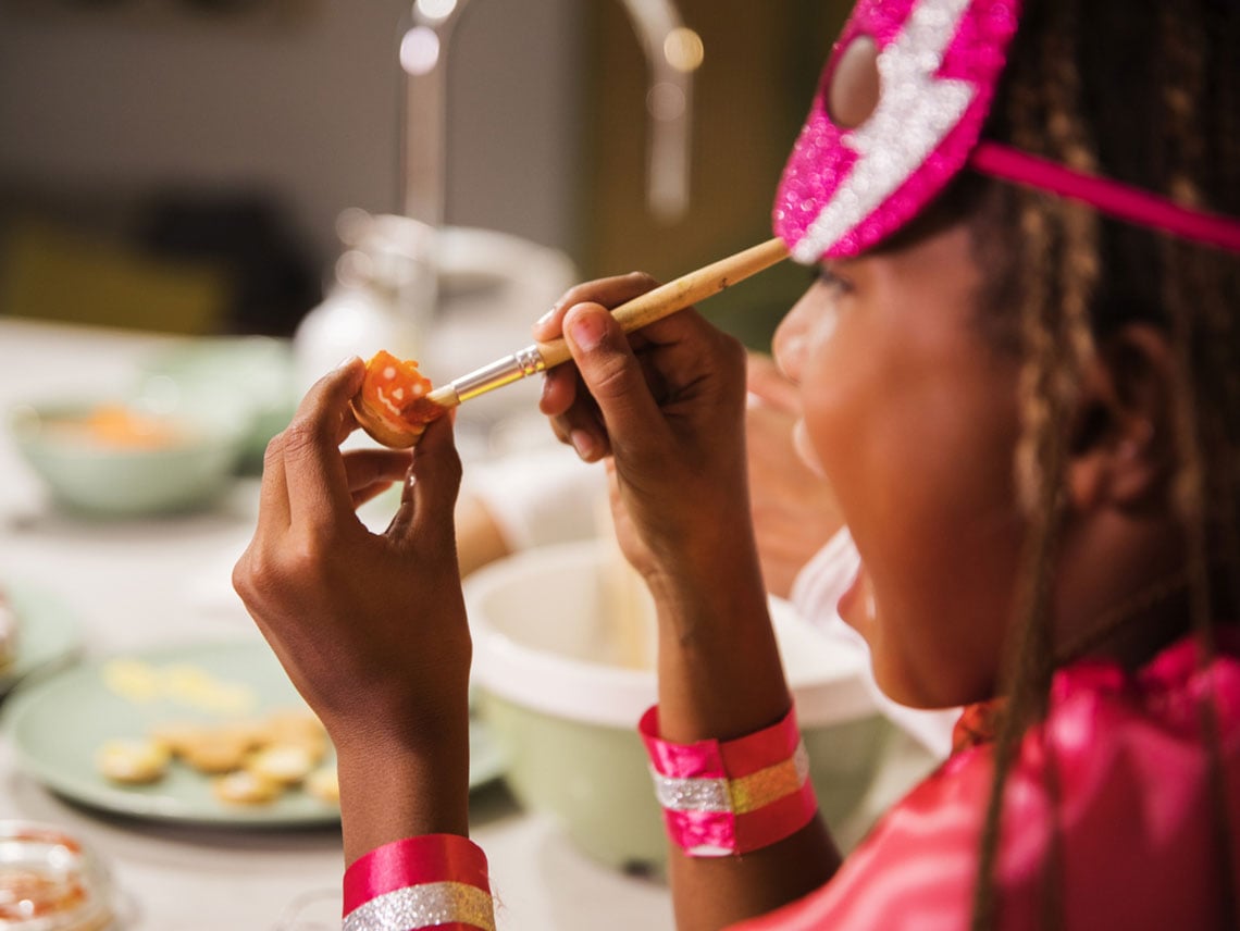 Pinta la careta con pintura acrílica, que es de fácil secado y está hecha con un material plastificado. Puedes hacer los detalles, como pestañas largas, con cola de brillo. El pelo lo harás con lana de colores.