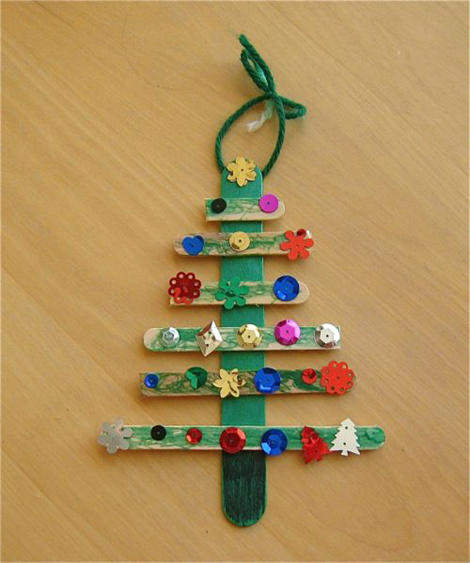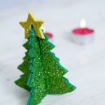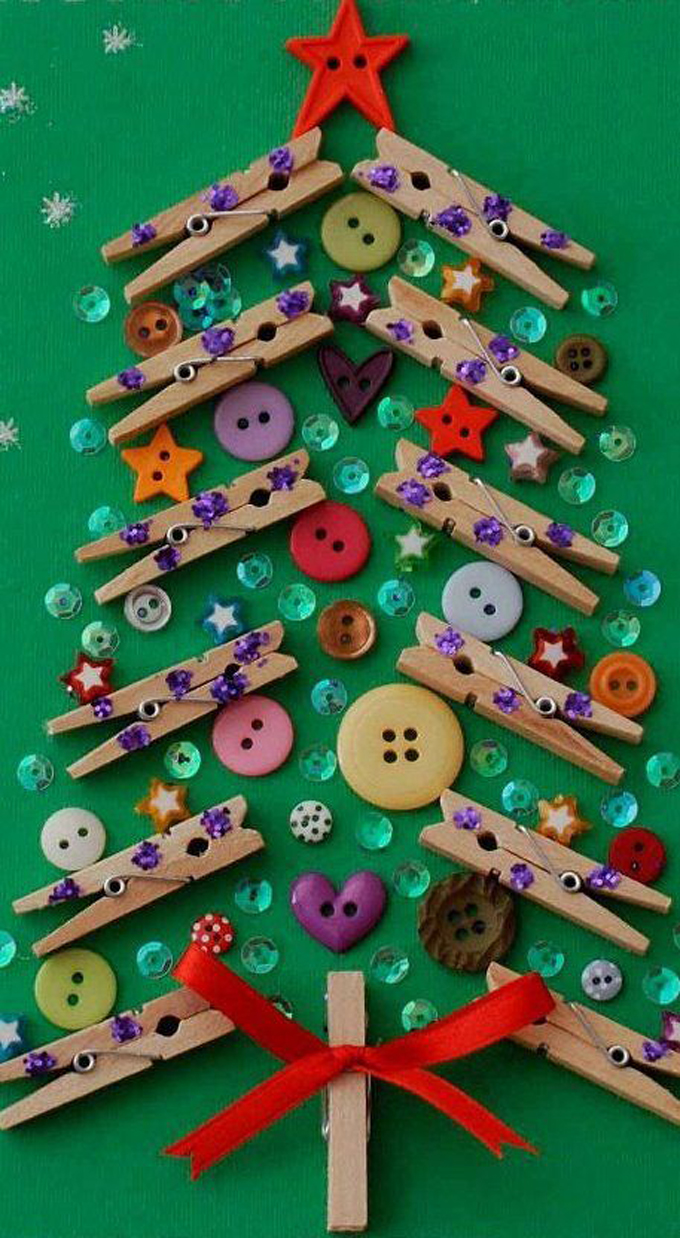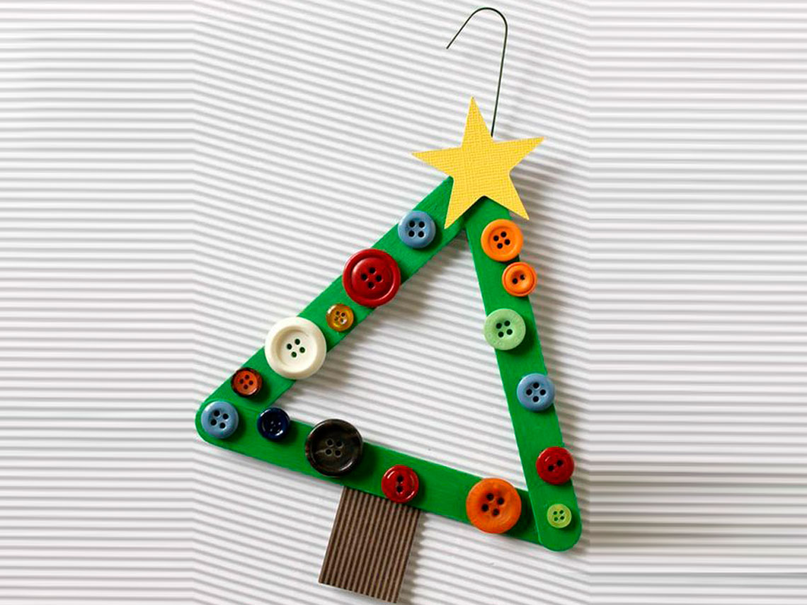 Corta unas tiras de cartulina verde, ponlas formando un triángulo y pega botones de distintos colores sobre ellas. Las tiras harán de árbol y los botones, de las típicas bolitas de decoración.