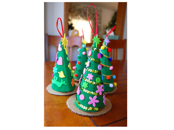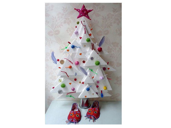 Con ayuda de unas cuantas planchas de poliestireno podemos formar un árbol de Navidad de lo más original. Los adornos podemos pegarlos con ayuda de un poco de pegamento.