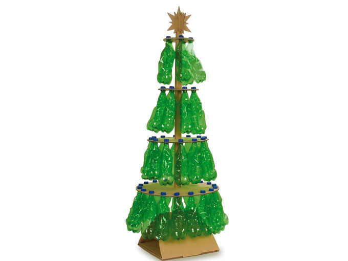 ¡Otro de nuestros preferidos! Para formar la estructura del árbol basta con recortar un montón de círculos de cartón y hacer agujeros en ellos del tamaño del tapón de las botellas.