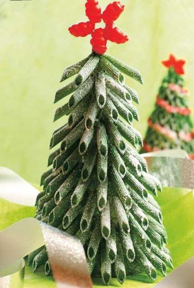 ¿Quién dijo que los macarrones solo valen para comerlos? La pasta de verdura es perfecta para hacer un árbol de Navidad.