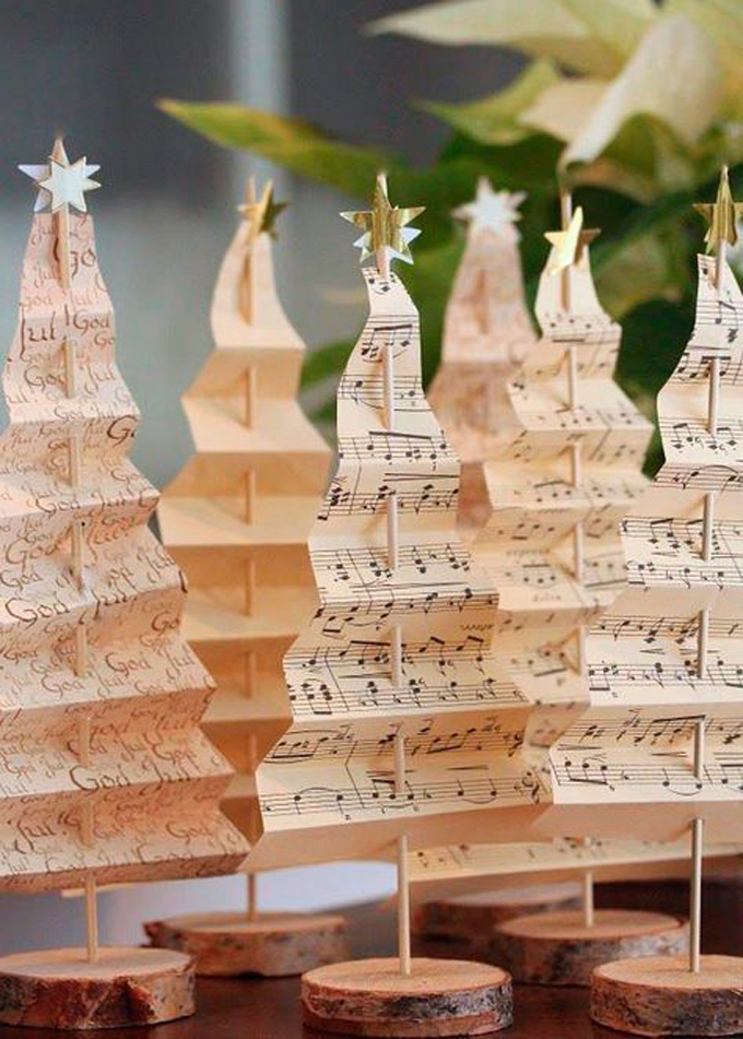 Las partituras musicales cortadas en forma de triángulo y atravesadas por un palillo largo forman un árbol de Navidad de lo más original.