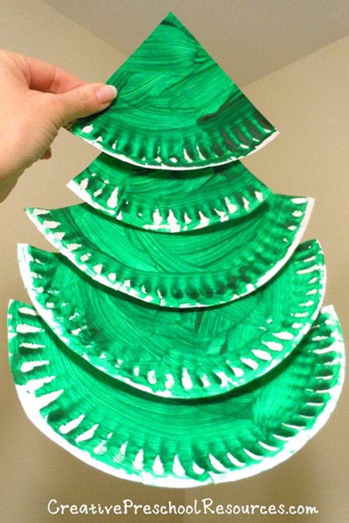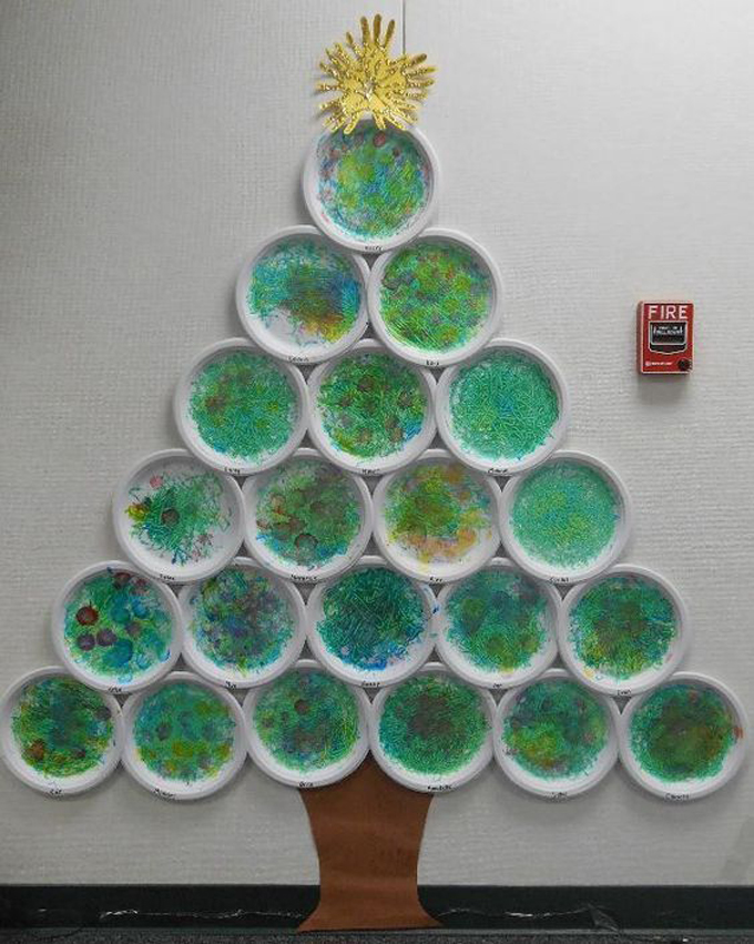 Para crear este árbol de Navidad solo hace falta pintar el fondo de los platos de plástico con témpera verde y ordenarlos en una pared en forma de árbol.